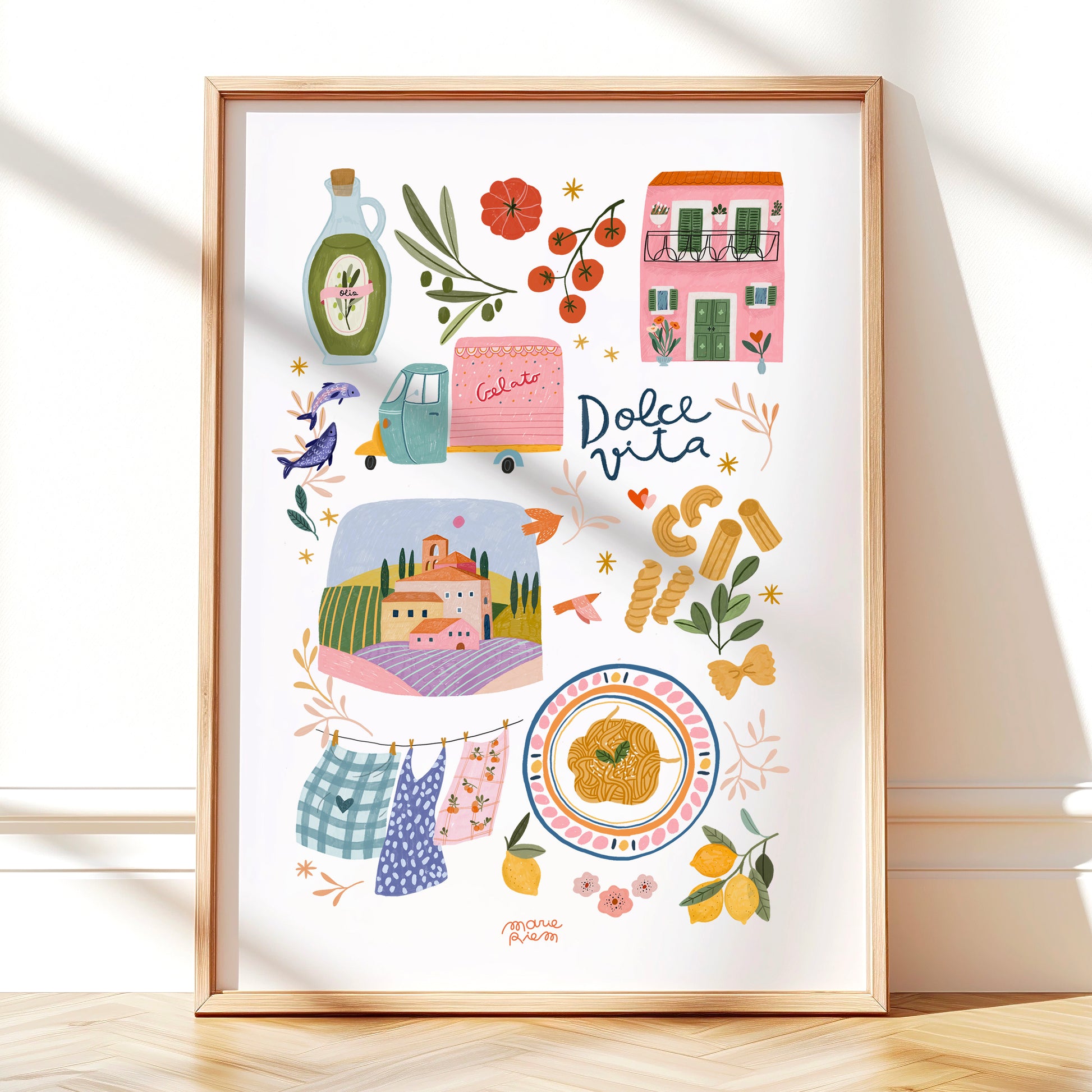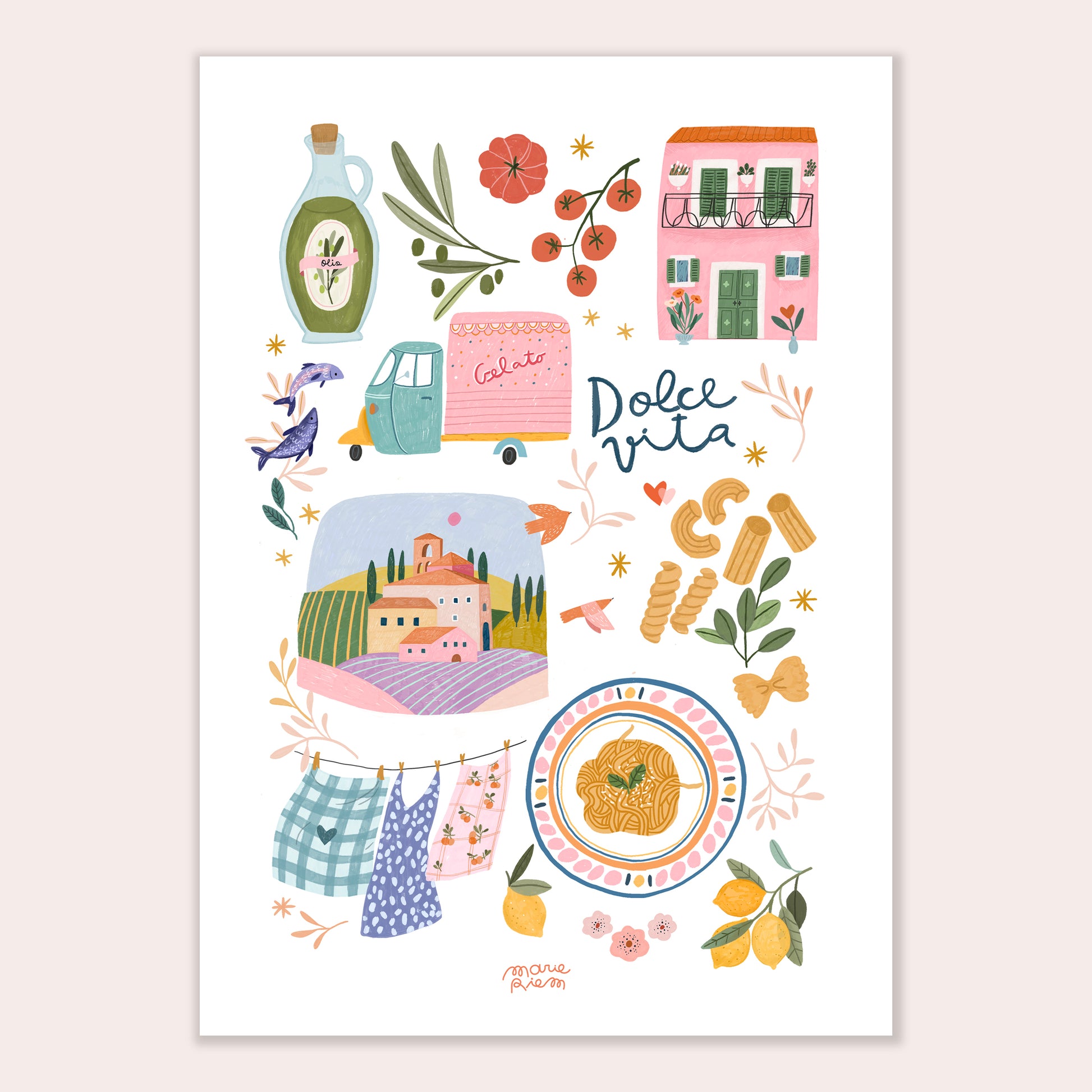 - Illustration imprimée sur un papier dessin épais (300 g) texturé (pour les formats A6, A5, A4, A3) -- (170 g pour le format A2)