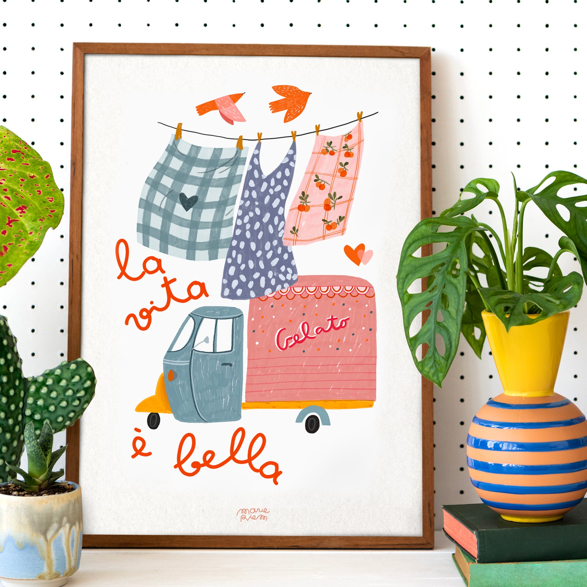 - Illustration imprimée sur un papier dessin épais (300 g) texturé (pour les formats A6, A5, A4, A3) -- (170 g pour le format A2)